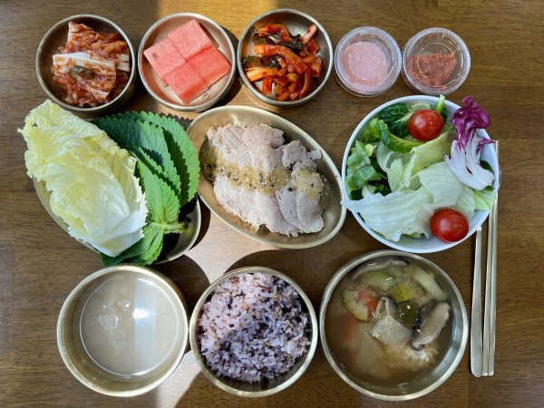 잡곡밥/ 누룽지/ 꽃게된장찌개/ 마늘보쌈/