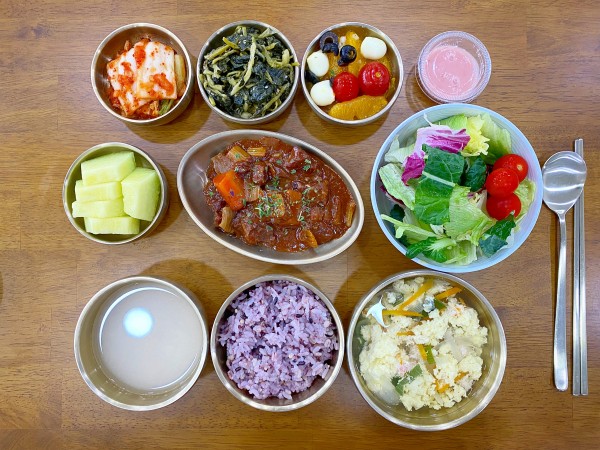 잡곡밥/ 누룽지/ 게살계란국/ 비프부르기뇽/