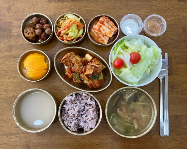 잡곡밥/누룽지/ 얼큰버섯국/ 매콤돼지갈비찜/