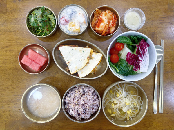 잡곡밥/ 누룽지/ 콩나물국/ 비프퀘사디아/