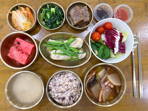 메밀전병/ 비타민나물/ 김치/ 계절샐러드/ 수박