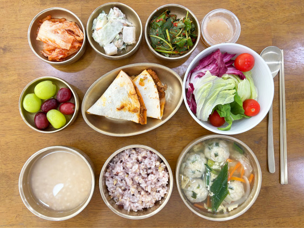 잡곡밥/ 누룽지/ 굴림만두국/ 비프퀘사디아/