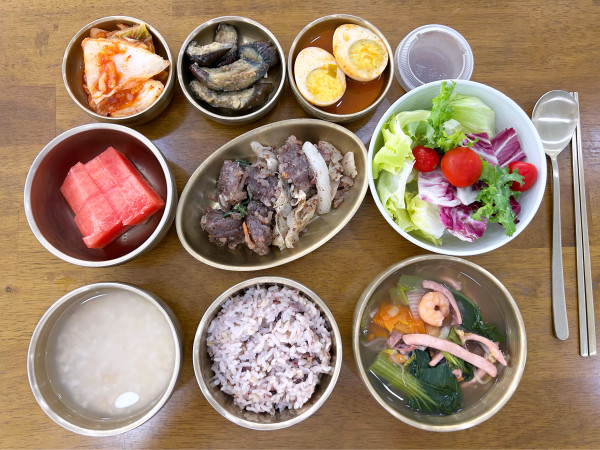 계란볶이/ 가지된장구이/ 김치/ 계절샐러드/ 수박