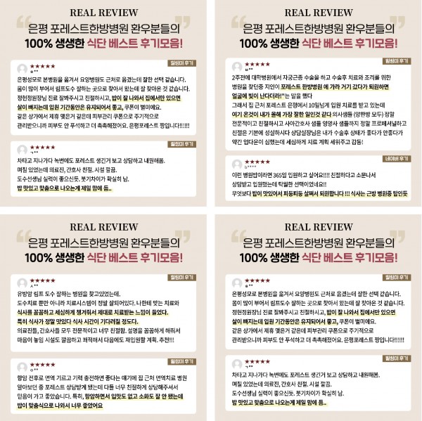 은평 포레스트한방병원 식단 후기 [게시글 내용] 안녕하세요 포레스트입니다:) 은평 포레스트한방병원 환우분들의 100%생생한 식단 리얼 후기를 소개합니다! 은평 포레스트한방병원은 맛있는 식사로 소문이 자자합니다! 실제 베스트 후기를 선정해서 안내드립니다~! 환우분들의 건강을 위해서 포레스트는 아낌없는 투자와 끝없는 노력하겠습니다♡ 목록