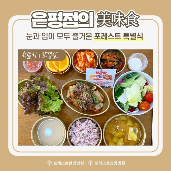 은평점만의 美味食(특별메뉴) 안녕하세요 포레스트입니다 :)! 최근 은평 포레스트한방병원의 밥이 맛있다고 소문이 자자하게 났습니다~ 쉐프님이 직접 만들어주시는 이탈리아식 푸딩부터 '경칩' 기념 봄나물 비빔밥까지! 환우분들의 건강과 힐링에 아낌없는 투자를 하는 은평 포레스트한방병원입니다 :) 목록