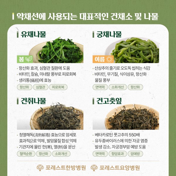 약채선에 사용되는 대표적인 건채소 및 나무들을 확인해 보세요