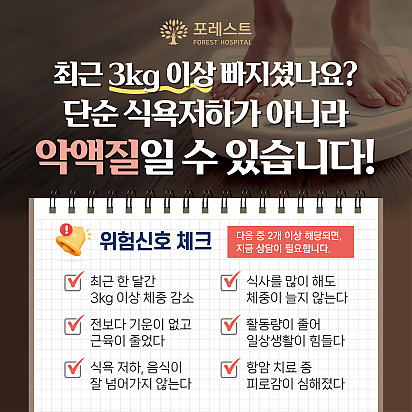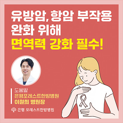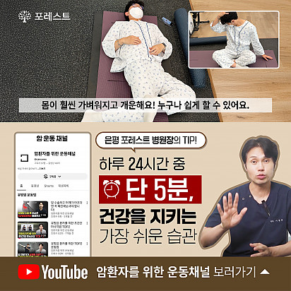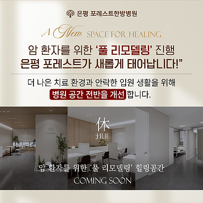 자궁내막암 3기, 박지혜 환우님의 희망일지 ep_1 | 포레스트 환우 이야기 2024.08.08 자궁내막암 3기, 박지혜 환우님의 희망일지 ep_2 | 포레스트 환우 이야기 2024.08.08 자궁내막암 3기, 박지혜 환우님의 희망일지 ep_3 | 포레스트 환우 이야기 2024.08.08 폐암 4기(비소세포암), 서중원 환우님의 희망일지 ep_1 | 포레스트 환우 이야기 2024.08.08 폐암 4기(비소세포암), 서중원 환우님의 희망일지 ep_2 | 포레스트 환우 이야기 2024.08.08 폐암 4기(비소세포암), 서중원 환우님의 희망일지 ep_3 | 포레스트 환우 이야기 2024.08.08 Hot [건강정보] 두통에 도움되는 간단한 지압법 소개드립니다. 안녕하세요, 포레스트입니다! ???? 오늘은 두통에 자주 시달리시는 분들을 위해 하루 1분! 가벼운 두통이 있을 때 하면 … 2025.12.10 Hot 은평 포레스트 리뉴얼 완료! 은평 포레스트한방병원이 오랫동안 준비해온 공간 리뉴얼을 마쳤습니다. ※ 새로워진 공간 - 55병상 재구… 2025.12.08 Hot [건강정보]독감, 감기와 달라요! 감기와 독감, 비슷해 보여도 원인·증상·진행 속도 모두 다르다는 사실 알고 계셨나요? 이번 영상에서는 두 질환의 차이를 딱 … 2025.11.25 Hot 암 환자의 절반 이상이 겪는 숨은 적, ‘악액질’ 암 환자의 절반 이상이 겪는 숨은 적, ‘악액질’. 단순히 살이 빠지는 문제가 아니라, 근육이 소모되고 체력이 급격히 떨어지… 2025.11.13 Hot 유방암 항암 부작용 완화, 핵심은 ‘면역력’입니다. 이번 카드뉴스에서는 은평 포레스트 이철희 병원장님이 전하는 ‘유방암 치료 후 회복을 위한 면역 관리법’을 쉽… 2025.11.06 Hot 포레스트 항암식이팀, 2025 코리아 월드푸드 챔피언십 환경부장관상(대상) 수상! 두구두구두구 포레스트 식이 Chef팀이 2025 Korea World Food Championship 라이브경연 부문에서… 2025.11.04 Hot 포레스트의 악액질(Cachexia) 검사와 치료 암 진단을 받고 항암치료 중이거나 수술 후 요양 중이신 분들이라면 잘 먹어도 갑자기 몸무게가 확 빠지는 경험이 있… 2025.10.30 Hot [암환자를 위한 운동 채널] 소개합니다! “영상으로 함께 회복을 시작하세요!” 원내에서도, 집에서도 안전하게 따라할 수 있는 [암환자를 위한 운동 채널]… 2025.10.27 Hot 은평 포레스트 리모델링 소식 은평 포레스트가 환자분들의 치료와 회복에 최적화된 공간으로 새로워집니다. Coming Soon … 2025.10.20 12345 Search 검색대상 제목 내용 제목+내용 회원아이디 회원아이디(코) 글쓴이 글쓴이(코) 검색어 필수