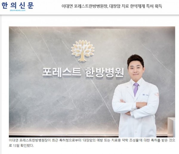 [한의신문]이대연 포레스트한방병원장, 대장암 치료 한약제제 특허 획득