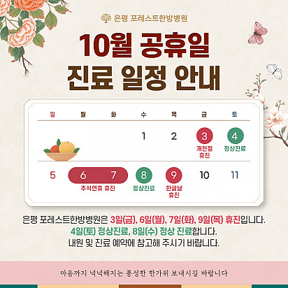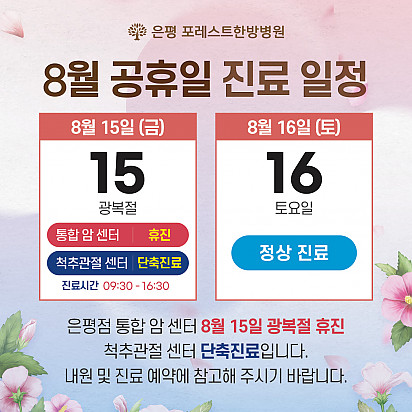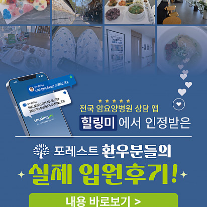 자궁내막암 3기, 박지혜 환우님의 희망일지 ep_1 | 포레스트 환우 이야기 2024.08.08 자궁내막암 3기, 박지혜 환우님의 희망일지 ep_2 | 포레스트 환우 이야기 2024.08.08 자궁내막암 3기, 박지혜 환우님의 희망일지 ep_3 | 포레스트 환우 이야기 2024.08.08 폐암 4기(비소세포암), 서중원 환우님의 희망일지 ep_1 | 포레스트 환우 이야기 2024.08.08 폐암 4기(비소세포암), 서중원 환우님의 희망일지 ep_2 | 포레스트 환우 이야기 2024.08.08 폐암 4기(비소세포암), 서중원 환우님의 희망일지 ep_3 | 포레스트 환우 이야기 2024.08.08 Hot 자연이 주는 보약, 제철 식단 자연이 주는 보약, 제철 식단 가을에 나는 음식은 가을에 먹어야 합니다. 가장 영양이 풍부한 제철 식재료로 몸… 2025.10.10 Hot 힐링미 앱의 은평 포레스트 입원 환우 후기 전국 암요양병원 상담 앱 힐링미에서 인정받은 포레스트 입원 환우 후기 포레스트는 환자 한 분, 한 분의 이야기에 귀 기… 2025.10.02 Hot 포레스트 10월 휴진 안내 안녕하세요, 포레스트입니다. 다가오는 10월 은평점 휴진 일정을 미리 알려드리오니 내원과 예약에 참고하시길 바랍니다. 언… 2025.09.22 Hot 작은 감기도 크게 번질 수 있는 암 환자의 환절기 건강수칙 작은 감기도 크게 번질 수 있는 암 환자의 환절기 건강수칙 환절기에는 큰 일교차와 건조한 공기로 호흡기 질환이 늘어나… 2025.09.17 Hot 포레스트 힐링 운동 프로그램 포레스트는 환우분들의 건강한 일상을 위해 운동 프로그램을 운영하고있습니다. ✅ 왜 운동이 필요할까요? 항암 치료 과정에… 2025.09.09 Hot [뇌종양 환자를 위한 운동법] 기억력 감소, 브레인포그. 이거 하나면 충분합니다. 두통, 어지럼증, 불안… 뇌종양 환자라면 매일 마주하는 어려움이죠. 은평 포레스트한방병원 이철희병원장님의 단 5분, 간… 2025.09.05 Hot 은평 포레스트 병원장의 마음속 이야기 ”어떻게 해야 아픈 사람의 자리를 덜 외롭고,덜 무섭게 만들 수 있을까?“은평 포레스트 한방병원 이철희 병원장은이 질문을 매일… 2025.08.14 Hot 포레스트 8월 광복절 휴진 안내 [ 포레스트 8월 광복절 휴진 안내 ] 2025년 8월 15일 (금) 은평 포레스트는 통합 암센터 - 광복절 휴진 … 2025.08.07 Hot 이 보라색이 면역력을 살립니다?! 가지에 숨겨진 힘 보라색 채소의 대표 주자, 가지! 그냥 먹으면 손해?! 암 예방에 도움을 줄 수 있는 '파이토케미컬'의 비밀과 가… 2025.07.24 12345 Search 검색대상 제목 내용 제목+내용 회원아이디 회원아이디(코) 글쓴이 글쓴이(코) 검색어 필수