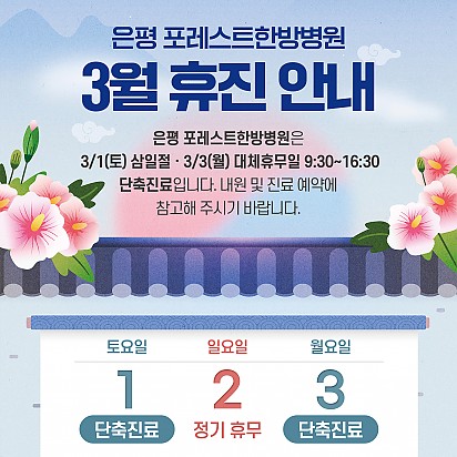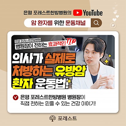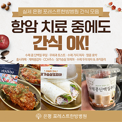 자궁내막암 3기, 박지혜 환우님의 희망일지 ep_1 | 포레스트 환우 이야기 2024.08.08 자궁내막암 3기, 박지혜 환우님의 희망일지 ep_2 | 포레스트 환우 이야기 2024.08.08 자궁내막암 3기, 박지혜 환우님의 희망일지 ep_3 | 포레스트 환우 이야기 2024.08.08 폐암 4기(비소세포암), 서중원 환우님의 희망일지 ep_1 | 포레스트 환우 이야기 2024.08.08 폐암 4기(비소세포암), 서중원 환우님의 희망일지 ep_2 | 포레스트 환우 이야기 2024.08.08 폐암 4기(비소세포암), 서중원 환우님의 희망일지 ep_3 | 포레스트 환우 이야기 2024.08.08 Hot [포레스트 소식]암 환자 한방치료 연구, 학회지에 게재 포레스트의 소식을 전해드립니다. 포레스트 병원장님의 암 환자 대상 한방치료 경험 연구가 ‘대한예방한의학회지’에 정식 게재되… 2025.04.09 Hot 암 환자의 혈당 관리, 왜 중요할까요? ✅ 암 환자의 혈당 관리, 왜 중요할까요? 항암 치료 중 혈당이 상승하는 이유부터, 혈당이 높아지면 어떤 문제가 생기는지, … 2025.04.03 Hot 은평 포레스트한방병원에서 실제 제공된 건강 간식 모음 항암 치료 중에도 간식이 필요하다면? "간식 먹어도 될까?" 고민하는 암 환자분들을 위해 준비했습니다! 은평 포레스트한방병… 2025.03.27 Hot [약채선] 시금치, 아무렇게나 먹으면 오히려 독?! 건강한 섭취법 공개 시금치는 암 예방에 도움을 줄 수 있을까요? 한의학에서는 시금치를 어떻게 바라볼까요? 이번 영상에서는 시금치의 주요 성분과 … 2025.03.20 Hot 유방암 환자를 위한 TOP2 운동법 안녕하세요 포레스트입니다♥ 오늘은 유방암 환우분들을 위한 스트레칭 영상을 소개합니다! 유방암 수술 후 어깨가 자꾸 뻐… 2025.03.12 Hot 은평 포레스트한방병원 둘러보기 은평 포레스트한방병원 둘러보기 :) 환자분들의 편안한 치료와 힐링을 위한 공간, 은평 포레스트한방병원을 소개합니다! … 2025.03.04 Hot 포레스트 3월 진료 안내 안녕하세요, 포레스트입니다. 다가오는 3월 1일(토) 삼일절 및 3월 3일(월) 대체공휴일 진료 일정을 안내드립니다. … 2025.02.20 Hot 은평점 건강 간식 모음 [ 은평 포레스트한방병원 건강 간식 모음 ] 건강은 작은 습관에서 시작됩니다! 포레스트한방병원 은평점에서는 환자분들의 영양… 2025.02.19 Hot 은평점 겨울 간식 모음 ❄ 은평점 겨울 간식 모음 ❄ 겨울이 되면 더욱 생각나는 따뜻하고 든든한 간식들! 은평점에서 환자분들의 건강을 고려한 겨울… 2025.02.11 12345 Search 검색대상 제목 내용 제목+내용 회원아이디 회원아이디(코) 글쓴이 글쓴이(코) 검색어 필수