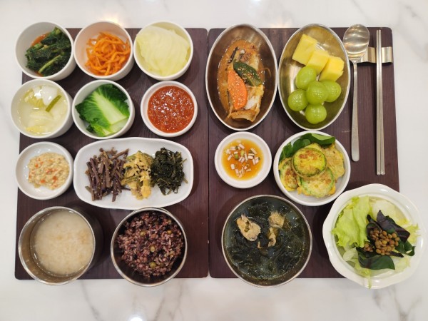 2월 24일 항암식단 [2/24 월요일 중식] 잡곡밥/누룽지/굴미역국/매콤코다리조림/ 애호박전(라이브)/봄동숙쌈&강된장/ 진미채볶음/고사리*곤드레*호박고지나물/ 양배추쌈/김치&물김치/계절샐러드/파인애플&포도 목록