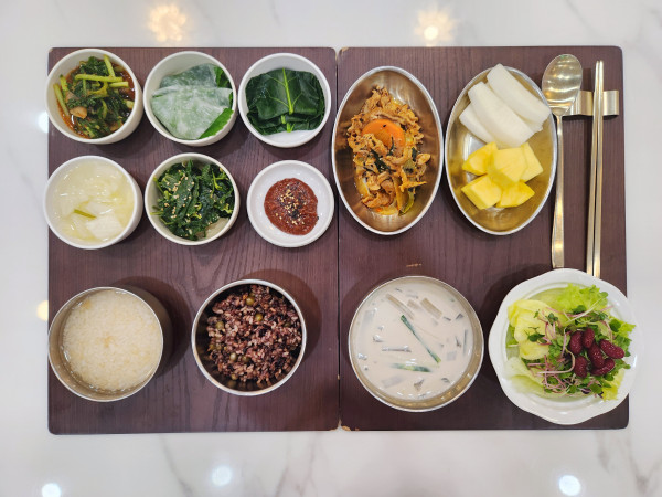 잡곡밥/누룽지/검은콩우무냉국/오리주물럭/