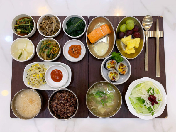 6월 19일 항암식단 [6/19 목요일 중식] 잡곡밥/누룽지/소고기무국/연어구이*렌치드레싱/ 궁중잡채/건고구마순나물무침/김밥(라이브)/ 콩나물무침/케일숙쌈/김치&물김치/계절샐러드/ 파인애플*포도 목록