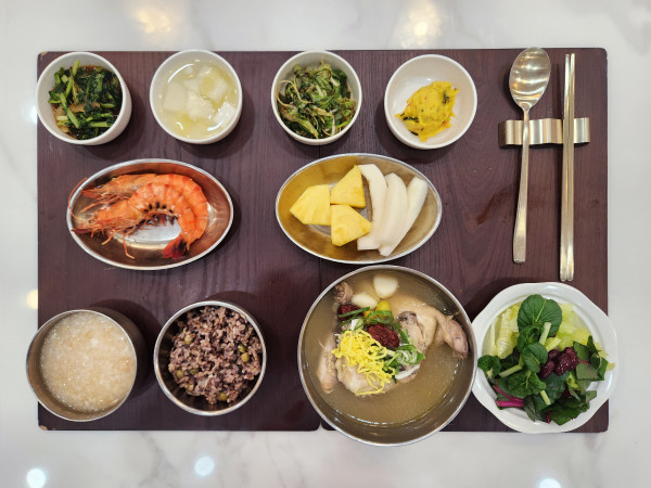 잡곡밥/누룽지/반계탕/새우구이/단호박샐러드/