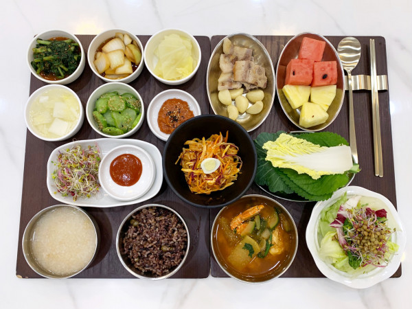 5월 28일 항암식단 [5/28 수요일 중식] 잡곡밥/누룽지/꽃게탕/목살소금구이*쌈채소,숙채/ 매실청오이무침/양파장아찌/쫄면(라이브)/모둠새싹/ 양배추쌈/김치&물김치/계절샐러드/파인애플*수박 목록