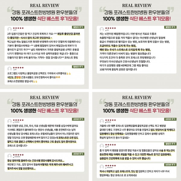 강동 포레스트한방병원 식단 후기 안녕하세요 포레스트입니다:) 강동 포레스트한방병원 환우분들의 100% 리얼 식단 후기를 소개합니다. 강동 포레스트는 환우분들의 입맛을 사로잡을 뿐만 아니라 영양까지 놓치지 않겠습니다! 환우분들 한 분 한 분의 마음을 헤아리며, 친절하고 세심한 서비스를 제공하기 위해 최선을 다하겠습니다♡ 목록