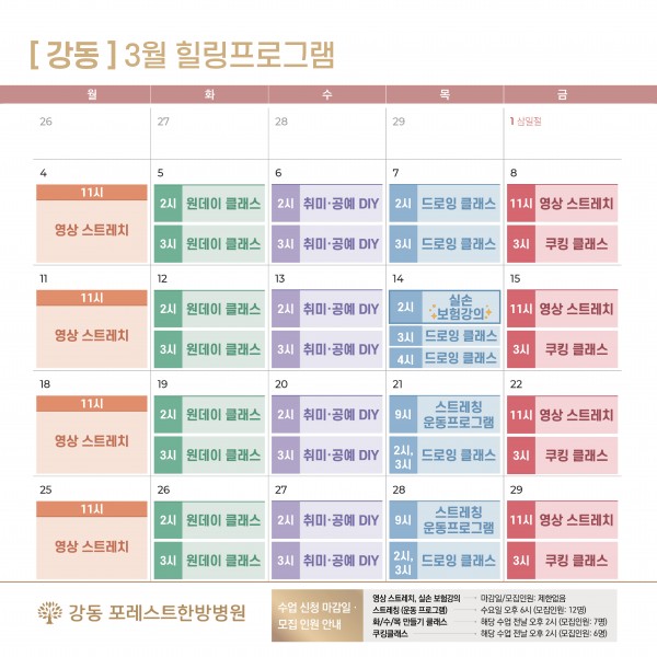 3월 힐링프로그램 포레스트의 3월 힐링프로그램을 소개합니다 :)♡ 삼일절의 기운과 시작하는 3월! 환우분들을 위해서 더욱 다양한 프로그램으로 돌아온 포레스트입니다 :)! ☆ 강남점에서 매주 토요일 특별진료와 암Q&A 시간이 새로 편성되었으니 많은 관심 부탁드립니다~ 언제나 환우분들의 몸과 마음의 힐링을 위하여 생각하고 연구하는 포레스트입니다♡ 목록