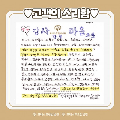 자궁내막암 3기, 박지혜 환우님의 희망일지 ep_1 | 포레스트 환우 이야기 2024.08.08 자궁내막암 3기, 박지혜 환우님의 희망일지 ep_2 | 포레스트 환우 이야기 2024.08.08 자궁내막암 3기, 박지혜 환우님의 희망일지 ep_3 | 포레스트 환우 이야기 2024.08.08 폐암 4기(비소세포암), 서중원 환우님의 희망일지 ep_1 | 포레스트 환우 이야기 2024.08.08 폐암 4기(비소세포암), 서중원 환우님의 희망일지 ep_2 | 포레스트 환우 이야기 2024.08.08 폐암 4기(비소세포암), 서중원 환우님의 희망일지 ep_3 | 포레스트 환우 이야기 2024.08.08 Hot 포레스트 운동프로그램 2편 포레스트한방병원 강동 최원식물리치료팀장님의 운동프로그램 2편입니다. 이번편에서는 코어운동, 유산소운동을 배워 보실 수 있습니… 2023.09.15 Hot 고객의 소리함 포레스트한방병원 강동점에 전달 된 고객의 소리함입니다. 어느덧 4개월의 세월이 흘러갔습니다. 속상하고 암담한 마음으로 강… 2023.09.07 Hot 9월 힐링프로그램 포레스트의 9월 힐링프로그램을 소개합니다. 포레스트한방병원, 요양병원은 매달 환우분들의 힐링을 위하여 운동, DIY수업, … 2023.09.01 Hot 포레스트 메인 셰프진을 소개합니다~! 포레스트는 평창 전용농장에서 재배한 유기농 식자재를 사용하여, 특급호텔 출신, 국내 외 수상 경력 多 셰프진들의 손을 거쳐 … 2023.08.24 Hot 항암 영양교육 전문 영양사와 함께하는 포레스트한방병원 강동 항암 영양교육입니다! 정확한 영양정보로 매끼 올바를 방향으로 음식을 섭취… 2023.08.11 Hot 포레스트 통합 암 센터 정용철원장님 포레스트한방병원 강동점에 통합 암 센터 정용철원장님을 소개합니다. "공감과 소통을 통해 치료하겠습니다" 공감과 소통이 … 2023.08.08 Hot 포레스트 운동프로그램 포레스트한방병원 강동 최원식물리치료팀장님의 운동프로그램입니다. 포레스트 인기만점 운동프로그램을 퇴원후에 집에서도 따라 하실… 2023.08.03 Hot 8월 힐링프로그램 포레스트한방병원 강동 8월 힐링프로그램 안내입니다. -영상스트레치 -항암영양교육 -원데이클래스 -취미·공예 DIY … 2023.08.01 Hot 포레스트 “종근당건강 캔서코치” 관능평가(맛 선호도 평가) 협업 포레스트한방병원·요양병원은 “종근당건강 캔서코치” 관능평가(맛 선호도 평가) 협업을 통한 암 환자용 영양조제식품 개발에 기여했… 2023.07.26 1617181920 Search 검색대상 제목 내용 제목+내용 회원아이디 회원아이디(코) 글쓴이 글쓴이(코) 검색어 필수