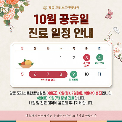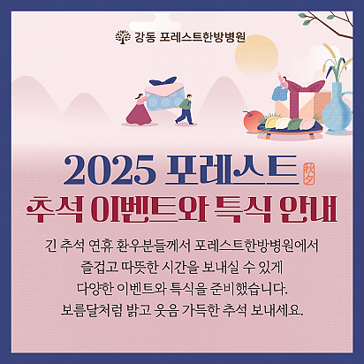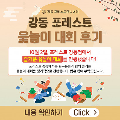 자궁내막암 3기, 박지혜 환우님의 희망일지 ep_1 | 포레스트 환우 이야기 2024.08.08 자궁내막암 3기, 박지혜 환우님의 희망일지 ep_2 | 포레스트 환우 이야기 2024.08.08 자궁내막암 3기, 박지혜 환우님의 희망일지 ep_3 | 포레스트 환우 이야기 2024.08.08 폐암 4기(비소세포암), 서중원 환우님의 희망일지 ep_1 | 포레스트 환우 이야기 2024.08.08 폐암 4기(비소세포암), 서중원 환우님의 희망일지 ep_2 | 포레스트 환우 이야기 2024.08.08 폐암 4기(비소세포암), 서중원 환우님의 희망일지 ep_3 | 포레스트 환우 이야기 2024.08.08 Hot 암 환자의 절반 이상이 겪는 숨은 적, ‘악액질’. 암 환자의 절반 이상이 겪는 숨은 적, ‘악액질’. 단순히 살이 빠지는 문제가 아니라, 근육이 소모되고 체력이 급격히 떨어지… 2025.11.13 Hot 포레스트 항암식이팀, 2025 코리아 월드푸드 챔피언십 환경부장관상(대상) 수상! 두구두구두구 포레스트 식이 Chef팀이 2025 Korea World Food Championship 라이… 2025.11.04 Hot 포레스트의 악액질(Cachexia) 검사와 치료 암 진단을 받고 항암치료 중이거나 수술 후 요양 중이신 분들이라면 잘 먹어도 갑자기 몸무게가 확 빠지는 경험이 있… 2025.10.30 Hot 강동 포레스트 윷놀이 대회 후기 함께 웃고, 함께 즐긴 하루! 10월 2일, 포레스트 강동점에서는 환우분들과 임직원 선생님들이 청팀과 백팀으로 나뉘어 즐… 2025.10.16 Hot 강동 포레스트 10월 힐링프로그램 10월 힐링프로그램을 소개합니다! 여러분 풍성한 한가위 연휴 잘 보내셨나요? 선선한 바람이 불어오는 10월, 한층 깊… 2025.10.14 Hot 자연이 주는 보약, 제철 식단 자연이 주는 보약, 제철 식단 가을에 나는 음식은 가을에 먹어야 합니다. 가장 영양이 풍부한 제철 식재료로 몸… 2025.10.10 Hot [강동] 10월 추석 맞이 이벤트와 특식 긴 추석 연휴 동안 환우분들께서 강동 포레스트한방병원에서 즐겁고 따뜻한 시간을 보내실 수 있도록 다양한 이벤트… 2025.09.26 Hot 포레스트 10월 휴진 안내 안녕하세요, 포레스트입니다. 다가오는 10월 강동점 휴진 일정을 미리 알려드리오니 내원과 예약에 참고하시길 바랍니다. &… 2025.09.22 Hot 작은 감기도 크게 번질 수 있는 암 환자의 환절기 건강수칙 작은 감기도 크게 번질 수 있는 암 환자의 환절기 건강수칙 환절기에는 큰 일교차와 건조한 공기로 호흡기 질환이 늘어나… 2025.09.17 12345 Search 검색대상 제목 내용 제목+내용 회원아이디 회원아이디(코) 글쓴이 글쓴이(코) 검색어 필수
