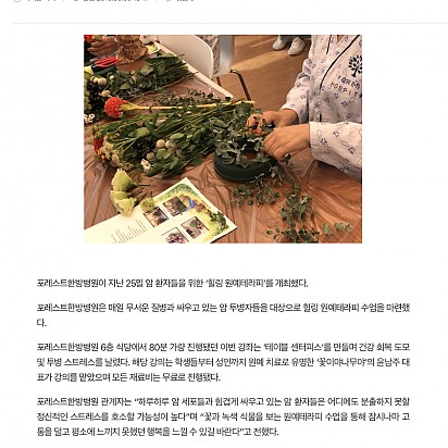 자궁내막암 3기, 박지혜 환우님의 희망일지 ep_1 | 포레스트 환우 이야기 2024.08.08 자궁내막암 3기, 박지혜 환우님의 희망일지 ep_2 | 포레스트 환우 이야기 2024.08.08 자궁내막암 3기, 박지혜 환우님의 희망일지 ep_3 | 포레스트 환우 이야기 2024.08.08 폐암 4기(비소세포암), 서중원 환우님의 희망일지 ep_1 | 포레스트 환우 이야기 2024.08.08 폐암 4기(비소세포암), 서중원 환우님의 희망일지 ep_2 | 포레스트 환우 이야기 2024.08.08 폐암 4기(비소세포암), 서중원 환우님의 희망일지 ep_3 | 포레스트 환우 이야기 2024.08.08 Hot [메디소비자뉴스]포레스트한방병원, 암 환자를 위한 '면역특강' 성황 -한ㆍ양방 병행치료, 주치의와 면담 등 호응도 높아…"면역력 관리 중요성 강조" 서울 송파구 방이동에 위치한 포레스트한방… 2021.05.18 Hot [베이비타임즈]추위로 인해 ‘찌릿’한 관절 통증, 치료와 예방법은? [베이비타임즈=송지나 기자] 본격적으로 겨울이 시작되면서 낮은 기온이 연일 이어지고 있다. 이러한 추위는 우리 몸에 영향… 2021.05.18 Hot [메디소비자뉴스]한의사ㆍ호텔 셰프 '밥심 합작품'…환자 '약선식단’이 뜬다 체질에 따라 음식에 한약제 배합으로 면역력 향상…맛ㆍ건강 다잡아 불규칙한 식사 습관으로 건강이 나빠 본적 있는가? 건… 2021.05.18 Hot [Queen]포레스트한방병원, 암 환우들을 위한 ‘면역앤 비타쥬스’ 행사 열려 포레스트한방병원이 지난 23일 암 환자들을 위한 ‘면역앤 비타쥬스’행사를 열었다. 포레스트한방병원 6층 식당에서 80분간… 2021.05.18 Hot [일간투데이]본격적인 겨울 추위 시작...효과 만점 감기 예방법은? [일간투데이 이성자 기자] 아침, 저녁으로 제법 쌀쌀한 기운이 맴돌고 있는 요즘 사람들의 옷차림 역시 점점 두꺼워지며 본격적인… 2021.05.18 Hot [헬스경향] 포레스트한방병원, SCI급 국제학술저널 논문 등재 포레스트한방병원이 11일 이대연 병원장, 이인희 연구소장의 공동 연구 논문이 9월 SCI급 국제학술지에 등재됐다고 밝혔다. … 2021.05.18 Hot [이투데이] 포레스트한방병원, SCI급 국제학술저널 논문 등재 이대연 포레스트한방병원 병원장과 이인희 연구소장의 공동 연구 논문 ‘Herbal Medicine FDY003 Inhibits … 2021.05.18 Hot [Queen] 포레스트한방병원, 암 환우들을 위한 '힐링원예테라피'개최 포레스트한방병원이 지난 25일 암 환자들을 위한 ‘힐링 원예테라피’를 개최했다. 포레스트한방병원은 매일 무서운 질병과 싸… 2021.05.18 Hot 추석연휴, 암 환우들이 주의해야 할 식단은? 암환우 추석연휴 식생활 포레스트한방병원 영양팀을 통해 추석 연휴동안 암환자가 주의해야 할 사항에 대해 알아보았습니다. … 2021.05.18 2627282930 Search 검색대상 제목 내용 제목+내용 회원아이디 회원아이디(코) 글쓴이 글쓴이(코) 검색어 필수