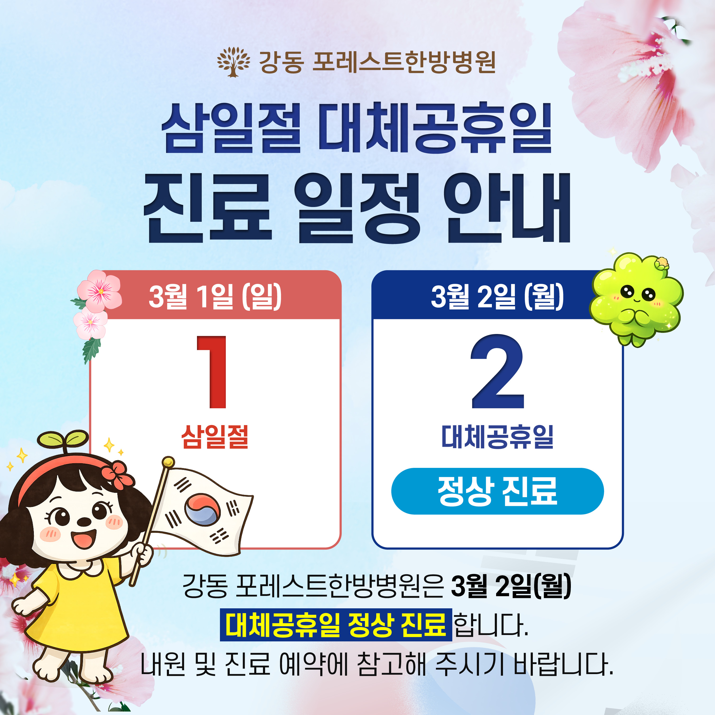 포레스트 삼일절 대체공휴일 진료 안내 안녕하세요, 포레스트입니다 삼일절 대체공휴일 진료(휴진) 일정 안내드립니다. 종로 · 강동 · 강남 · 은평 방문 전 꼭 확인해주세요 항상 믿고 찾아주셔서 감사합니다. 더 정성스러운 진료로 보답하겠습니다 ✅ 문의 : 1899-5868 ✅ 홈페이지 : foresthospital.co.kr ✅ 유튜브 : ‘포레스트병원’ 검색 목록