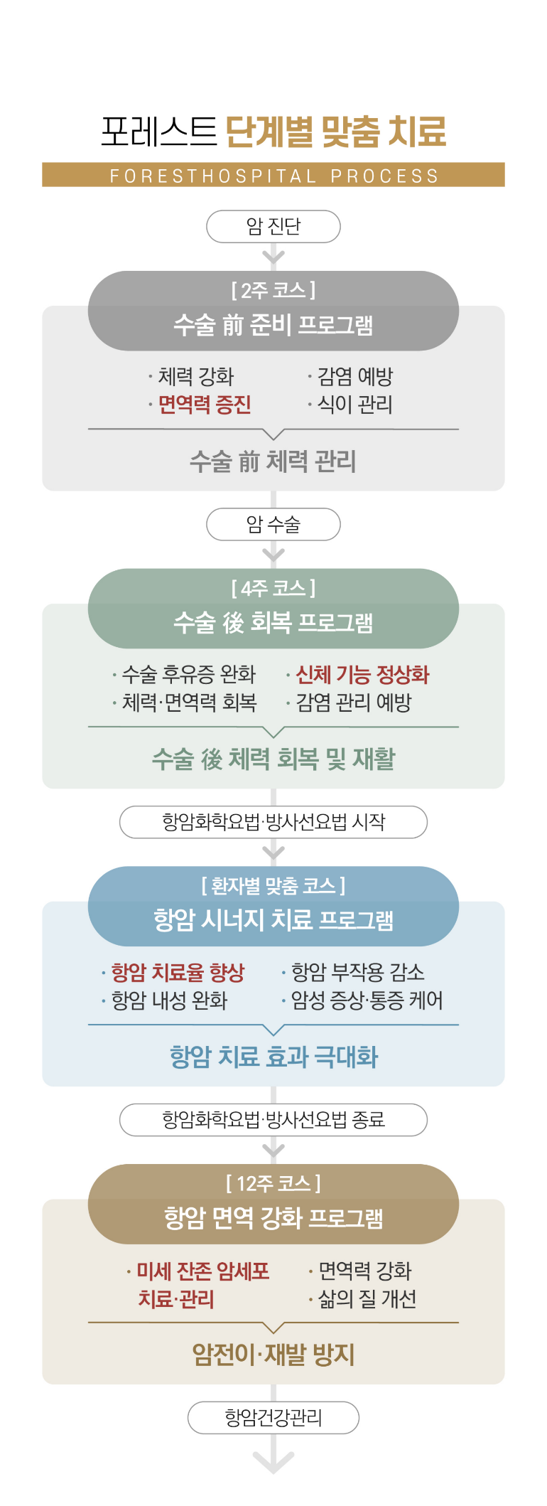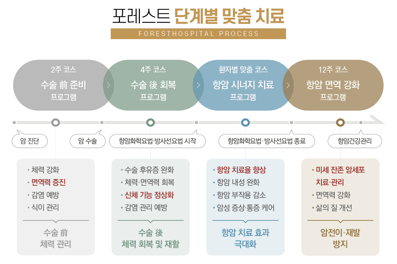 수술 후 회복프로그램 수술 후 감염 및 합병증 예방 관리와 수술 부위에 따른 맞춤 식이가 필수이며, 면역력 향상과 빠른 수술 부위 회복 치료가 필요합니다. · 면역증진요법수술에 따른 면역력 저하를 개선하는 치료 · 한방면역회복요법수술 후 저하된 면역력을 회복시키기 위한 한방면역치료 · 통증케어요법수술 및 암종양에 의한 통증을 완화하는 치료 · 감염관리·예방요법수술 이후의 감염을 관리·예방하기 위한 치료 · 식이영양요법수술 후 영양을 보충하고 체력을 회복시키는 고영양 식단 f 면역약침·면역스마트캡슐 포레환 당귀/녹용보혈탕 도수림프치료 싸이모신알파1·미슬토·이뮤노시아닌 영양수액요법(아연)