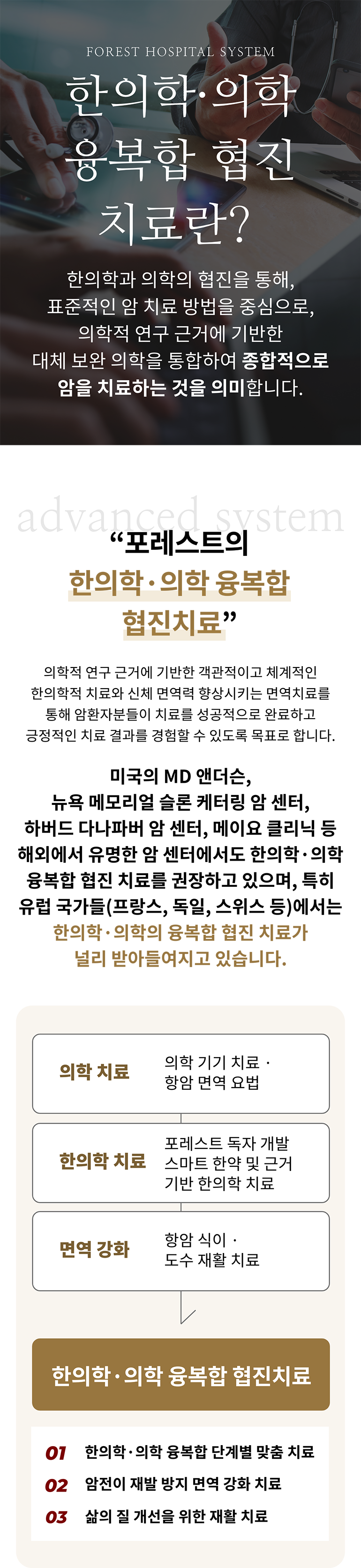 항암 면역 강화 프로그램 암전이·재발 예방, 항암·방사선 치료 후유증 관리, 낮아진 면역력 회복, 남아 있을 수 있는 미세 잔존암 사멸을 위한 한의학·의학 협진 치료가 필요합니다. · 한방항암보조요법암세포의 증식을 억제하고, 사멸을 촉진시키는 항암보조치료 · 항암면역강화요법항암면역력을 강화·암전이 재발을 억제하기 위한 치료 · 고주파온열 암 치료암세포 사멸을 촉진하고 화학·방사선의 효과를 높이는 치료 · 체력증강요법항암요법 이후에 저하된 체력 및 신체기능을 개선하는 치료 · 기타한방항암케어요법 TAF 프리미엄 농축액 TAF약침·TAF스마트캡슐 면역약침·면역스마트캡슐 포레 삼귀용탕 포레환 고주파온열 암 치료 싸이모신알파1·미슬토·이뮤노시아닌