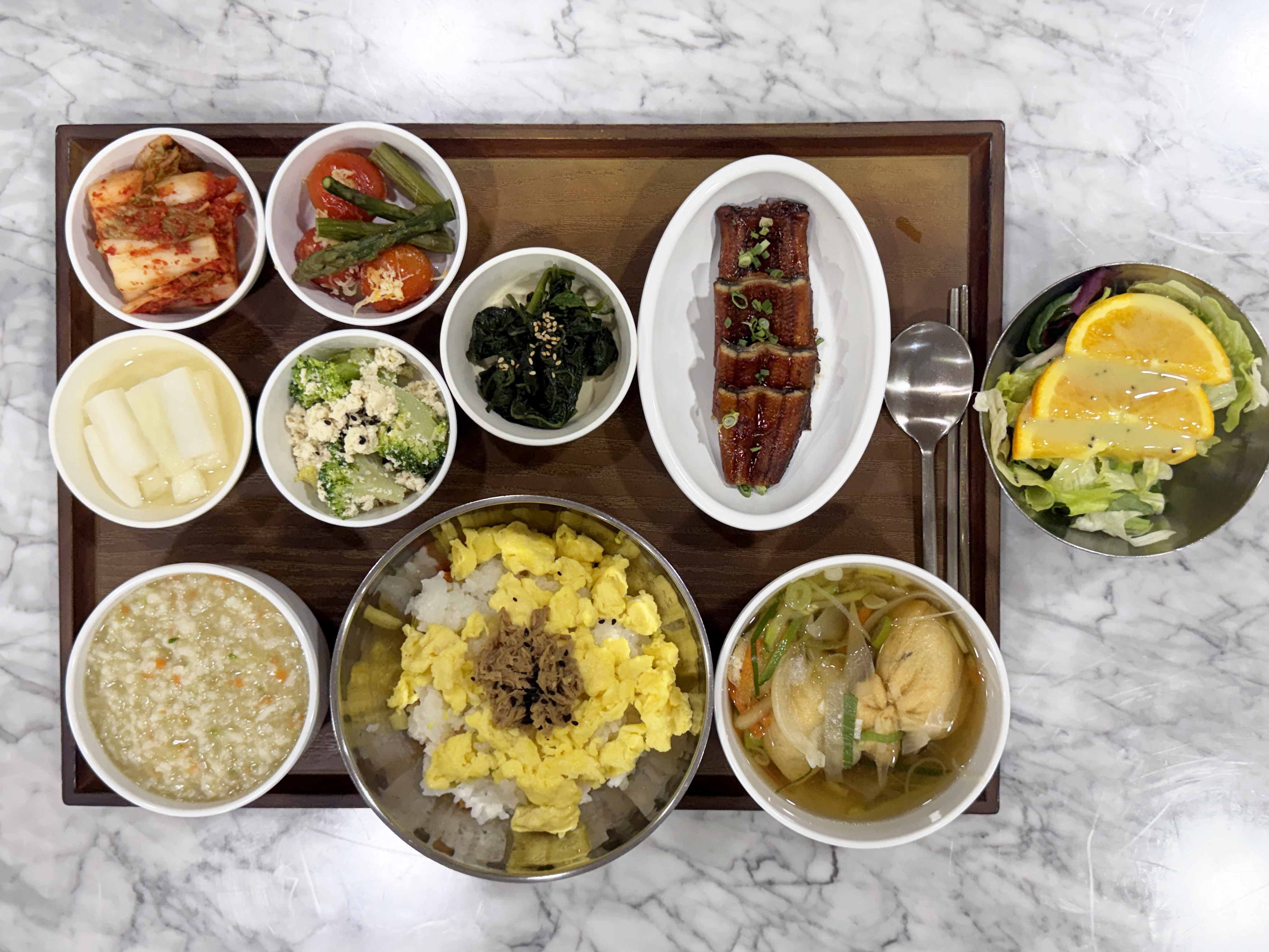 2월 3일 항암식단 [2/3 화요일 중식] 전복죽 / 계란장조림밥 / 유부주머니국 / 장어구이 / 아스파라거스&토마토치즈구이 / 브로컬리두부무침 / 곤드레나물 / 배추김치 / 계절샐러드 목록