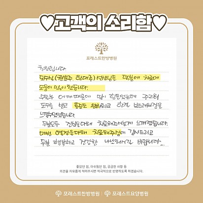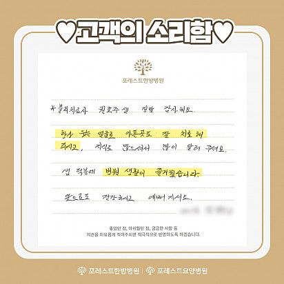 Hot 가을철에 먹으면 더 좋은 항암 식재료 TOP4 가을철에 먹으면 더 좋은 항암 식재료 TOP4를 소개합니다! 1. 무화과 2. 호박고구마 3. 송이버섯 4. 밤 … 2023.10.17 Hot 고객의 소리함 이번달 포레스트한방병원 강동, 포레스요양병원 강남, 포레스트한방병원 대구점의 전달 된 고객의소리함 모음zip입니다. "밥… 2023.10.12 Hot 10월 힐링프로그램 단풍 물들고 바람 시원한 가읠의 10월이 찾아왔습니다. 환우분들께 가을이 더욱 힐링 되는 계절로 느껴지시도록 준비한 포레스… 2023.10.06 Hot 포레스트요양병원 연합뉴스TV 방영 지난 10월 1일. 포레스트요양병원 강남 조현주 원장님과 포레스트 환우분들의 인터뷰가 연합뉴스TV에 방영 되었습니다. … 2023.10.04 Hot 포레스트 진료일정 안내 포레스트 진료일정 안내 포레스트한방병원·요양병원은 임시공휴일인 10/2(월)에 정상 진료하며, 추석연휴 9/28(목)~9… 2023.09.27 Hot 대만 한의사 협회 방문 지난 9월 18일(월)에 대만 한의사 협회에서 포레스트요양병원 강남점을 방문 해 주셨습니다. 대한한의사협회와 대만한의… 2023.09.26 Hot 포레스트 운동프로그램 2편 포레스트한방병원 강동 최원식물리치료팀장님의 운동프로그램 2편입니다. 이번편에서는 코어운동, 유산소운동을 배워 보실 수 있습니… 2023.09.15 Hot 고객의 소리함 포레스트요양병원 강남점에 전달 된 고객의 소리함입니다. #1 칭찬합니다. 도수실(권효주,한대종) 선생님들 덕분에 치료에… 2023.09.13 Hot 9월 힐링프로그램 포레스트의 9월 힐링프로그램을 소개합니다. 포레스트한방병원, 요양병원은 매달 환우분들의 힐링을 위하여 운동, DIY수업, … 2023.09.01 678910 Search 검색대상 제목 내용 제목+내용 회원아이디 회원아이디(코) 글쓴이 글쓴이(코) 검색어 필수