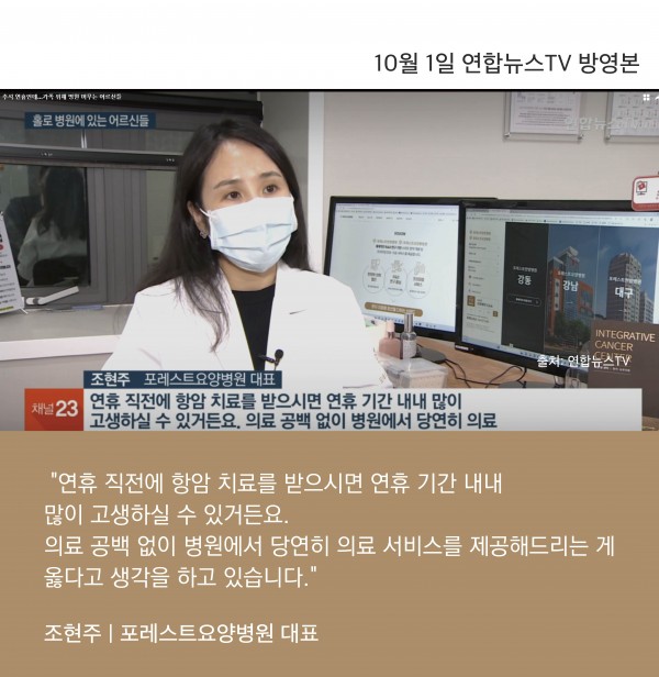 "연휴 직전에 항암 치료를 받으시면 연휴 기간 내내 많이 고생하실 수 있거든요. 의료 공백 없이 병원에서 당연히 의료 서비스를 제공해드리는 게 옳다고 생각을 하고 있습니다."(포레스트요양병원 조현주 병원장)