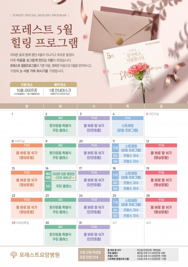 포레스트 힐링프로그램과 기쁜 마음, 행복한 마음으로 5월을 맞이하시고 가정에 늘 사랑이 가득하시기를 기원합니다. :)
