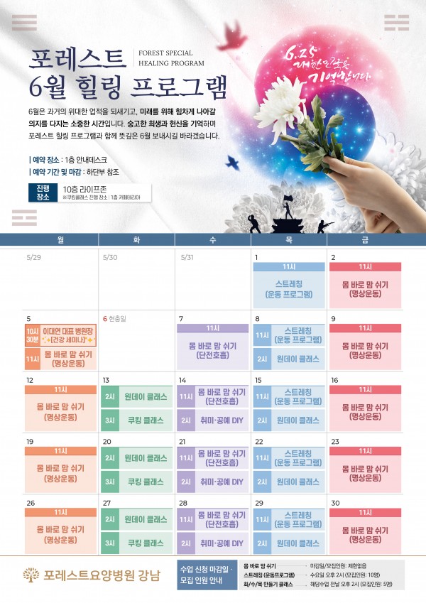 6월 힐링프로그램 안내 포레스트의 6월 힐링프로그램 안내입니다. ^^ 알짜배기 정보들을 알아보는 이대연 대표 병원장님의 건강 세미나와 맛있는 건강식을 내손으로 직접 만들어 볼수있는 쿠킹클래스까지~! 6월에도 다양한 프로그램들이 많이 준비되어 있으니 포레스트에서 힐링하세요.❤ 목록
