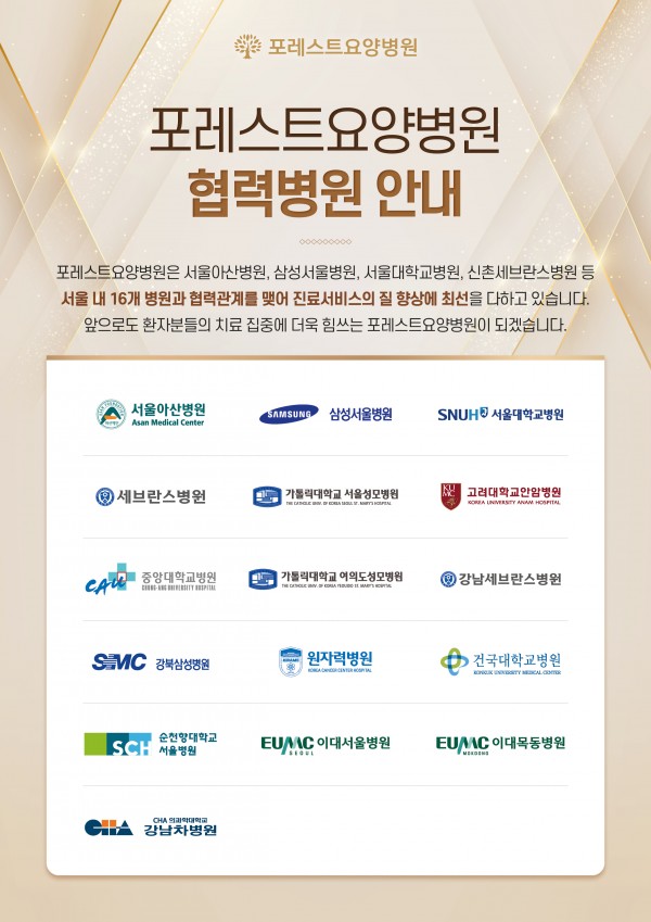 포레스트는 여러 병원들과 협력 관계를 맺어 진료서비스의 질 향상에 최선을 다하고 있습니다. 앞으로도 환자분들의 치료 집중에 더욱 힘쓰는 포레스트가 되겠습니다. :)