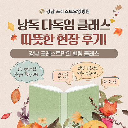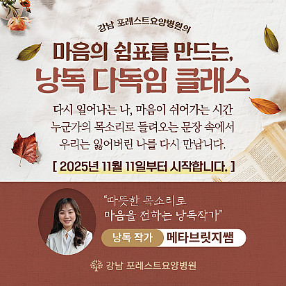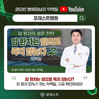 Hot [건강정보] 두통에 도움되는 간단한 지압법 소개드립니다. 안녕하세요, 포레스트입니다! ????오늘은 두통에 자주 시달리시는 분들을 위해하루 1분! 가벼운 두통이 있을 때 하면 좋을 지… 2025.12.10 Hot [건강정보]독감, 감기와 달라요! 감기와 독감, 비슷해 보여도 원인·증상·진행 속도 모두 다르다는 사실 알고 계셨나요? 이번 영상에서는 두 질환의 … 2025.11.25 Hot 암환우 힐링 프로그램 ‘속닥속닥 캠프’ OPEN! 한국암재활협회 × 포레스트 암환우 힐링 프로그램 ‘속닥속닥 캠프’ OPEN! 암 치료 과정에서 지친 마음을 회복… 2025.11.21 Hot 강남 포레스트 ‘낭독 다독임 클래스’ 따뜻한 현장 후기 강남 포레스트요양병원의 힐링 프로그램 중 많은 분들의 사랑을 받고 있는 ‘낭독 다독임 클래스’ 따뜻한 현장 후기를 소개드립… 2025.11.18 Hot 암 환자의 절반 이상이 겪는 숨은 적, ‘악액질’ 암 환자의 절반 이상이 겪는 숨은 적, ‘악액질’. 단순히 살이 빠지는 문제가 아니라, 근육이 소모되고 체력이 급격히 떨어지… 2025.11.13 Hot 강남점 낭독프로그램 작가 소개 강남 포레스트요양병원에서는 마음의 쉼표를 만드는 낭독 다독임 클래스가 진행 중입니다. 오늘은 함께해주시는 **낭독 작가 ‘… 2025.11.12 Hot 포레스트 항암식이팀, 2025 코리아 월드푸드 챔피언십 환경부장관상(대상) 수상! 두구두구두구 포레스트 식이 Chef팀이 2025 Korea World Food Championship 라이브경연 부문… 2025.11.04 Hot 포레스트의 악액질(Cachexia) 검사와 치료 암 진단을 받고 항암치료 중이거나 수술 후 요양 중이신 분들이라면 잘 먹어도 갑자기 몸무게가 확 빠지는 경험이 있… 2025.10.30 Hot 마음의 쉼표를 만드는, 낭독 다독임 클래스 강남 포레스트요양병원에서는 환우분들의 마음이 쉬어갈 수 있는 낭독 힐링 프로그램을 준비했습니다. 이번 클래스에서는 유… 2025.10.22 12345 Search 검색대상 제목 내용 제목+내용 회원아이디 회원아이디(코) 글쓴이 글쓴이(코) 검색어 필수