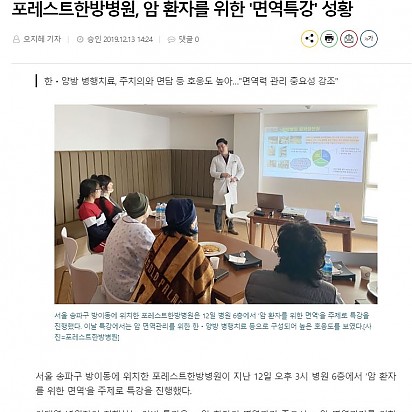 Hot [이투데이]포레스트한방병원, 병상 증설...“암 환자 위해 최선 다해 진료하겠다” 잠실 포레스트한방병원이 환자 증가로 인해 병상을 증설, 확장 개원했다. 지난해 5월 첫 진료를 시작한 이후 8개월 만에 병상 … 2021.05.18 Hot [오가닉라이프신문] 포레스트한방병원, 힐링프로그램 운영 포레스트한방병원이 운영하고 있는 ‘힐링프로그램’이 환자들을 대상으로 높은 호응을 얻고 있다. 포레스트한방병원의 힐링프로그… 2021.05.18 Hot [산업일보]허리 ‘찌릿’하다면, 바로 병원 가야하는 신호 평소 앉아서 업무를 하는 사무직은 잘못된 자세와 습관으로 인해 허리 통증을 느낄 때가 많다. 소위 ‘디스크’라고 알려진 추간판… 2021.05.18 Hot [폴리뉴스]유상철 감독도 걸린 생존율 11% ‘췌장암’, 해결법은? 2002년 월드컵 4강 신화의 주역 유상철 감독이 얼마 전 췌장암 4기 투병 소식을 전하면서 안타까움을 더했다. 췌장암은 발견… 2021.05.18 Hot [일간투데이]유방암 환자 큰 폭 증가, 無 증상이 무심코 암 키운다 [일간투데이 이성자 기자] 지난 10년 사이 유방암 환자가 의미 있는 수준으로 늘어났다는 언론 보도가 제기됐다. 유방암은 보통… 2021.05.18 Hot [메디컬투데이]관절 긴장 유발하는 겨울철 심해지는 어깨통증 20대 직장인 A씨는 옷을 입으려 손을 뻗었다 찌릿한 어깨 통증에 금세 손을 내렸다. 그는 아직 나이가 젊어 좀 아프다 말겠지… 2021.05.18 Hot [폴리뉴스]겨울철 남자들의 말 못 할 비밀, ‘전립선’ 질환 남성들에게는 겨울은 시련의 계절이다. 날이 추워지면 우리의 몸은 체온 유지를 위해 땀 배출은 줄이고 체내 수분량은 늘리게 된다… 2021.05.18 Hot [Queen]포레스트한방병원, 크리스마스 맞이 입원 환자 대상 이벤트 진행 포레스트한방병원이 크리스마스를 맞아 환자들을 대상으로 특별 이벤트를 진행했다고 24일 밝혔다. 포레스트한방병원은 의료진… 2021.05.18 Hot [메디소비자뉴스]포레스트한방병원, 암 환자를 위한 '면역특강' 성황 -한ㆍ양방 병행치료, 주치의와 면담 등 호응도 높아…"면역력 관리 중요성 강조" 서울 송파구 방이동에 위치한 포레스트한방… 2021.05.18 2122232425 Search 검색대상 제목 내용 제목+내용 회원아이디 회원아이디(코) 글쓴이 글쓴이(코) 검색어 필수