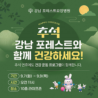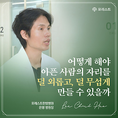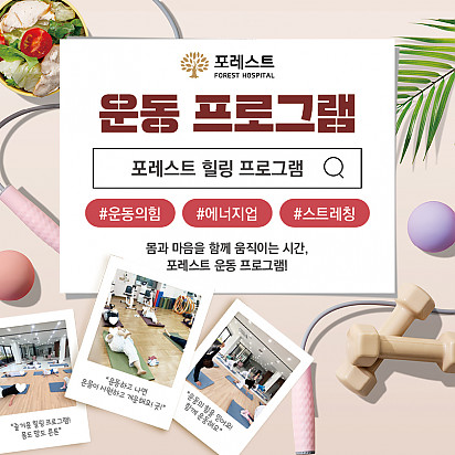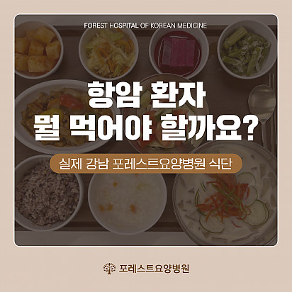 Hot 자연이 주는 보약, 제철 식단 자연이 주는 보약, 제철 식단 가을에 나는 음식은 가을에 먹어야 합니다. 가장 영양이 풍부한 제철 식재료로 몸… 2025.10.10 Hot 강남 포레스트 추석 연휴 운동 프로그램 운영! 해피 추석 추석 연휴, 맛있는 음식과 휴식만큼 중요한 건 바로 건강 지키기죠! 강남 포레스트요양병원에서는 연휴 동안에도 환… 2025.09.30 Hot 포레스트 10월 휴진 안내 안녕하세요, 포레스트입니다. 다가오는 10월 강동점 휴진 일정을 미리 알려드리오니 내원과 예약에 참고하시길 바랍니다. &… 2025.09.22 Hot [강남점 대학병원 외과 교수 출신 명의 초빙] 안녕하세요, 포레스트입니다. 환자 한 분 한 분에게 더 나은 의료서비스를 제공하기 위해 포레스트는 뛰어난 전문성과 수많은 … 2025.09.19 Hot 작은 감기도 크게 번질 수 있는 암 환자의 환절기 건강수칙 작은 감기도 크게 번질 수 있는 암 환자의 환절기 건강수칙 환절기에는 큰 일교차와 건조한 공기로 호흡기 질환이 늘어나… 2025.09.17 Hot 포레스트 힐링 운동 프로그램 포레스트는 환우분들의 건강한 일상을 위해 운동 프로그램을 운영하고있습니다. ✅ 왜 운동이 필요할까요? 항암 치료 과정에… 2025.09.09 Hot 강남 포레스트요양병원에서 실제로 제공되는 식단 강남 포레스트요양병원에서 실제로 제공되는 암 환자 식단을 담았습니다. 균형 잡힌 영양소와 소화에 … 2025.08.26 Hot 은평 포레스트 병원장의 마음속 이야기 ”어떻게 해야 아픈 사람의 자리를 덜 외롭고,덜 무섭게 만들 수 있을까?“은평 포레스트 한방병원 이철희 병원장은이 질문을 매일… 2025.08.14 Hot 포레스트 8월 광복절 휴진 안내 [ 포레스트 8월 광복절 휴진 안내 ] 2025년 8월 15일 (금) 강남 포레스트는 광복절 휴진입니다. 진료 및 내원 … 2025.08.07 12345 Search 검색대상 제목 내용 제목+내용 회원아이디 회원아이디(코) 글쓴이 글쓴이(코) 검색어 필수