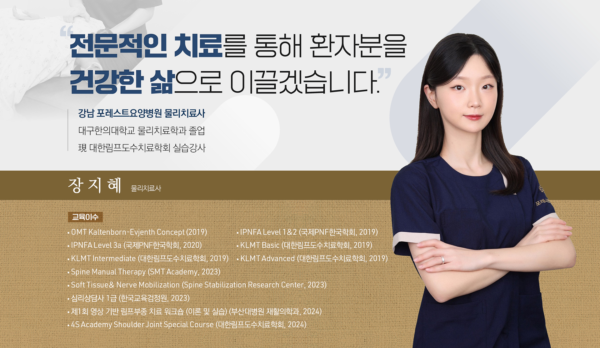 도수·물리·재활치료 수술 및 암종양에 의한 통증을 완화에 도움이 되는 도수·물리·재활치료 오랜 병상활동으로 신체활동 저하, 항암 후 근골격계 기능 저하 등 치료 전 후 다양한 후유증 치료에 도움. 체력 및 기력 저하를 해결하는데 탁월한 효과있음 도수치료는 약물을 사용하지 않는 비침습적 치료로 환자분들의 신체적 부담이 적음 도수·물리·재활치료의 장점 림프도수치료 치료사의 손에 의해 림프순환을 촉진하여 항암 관련 부작용이나 수술 후 림프절 손상으로 인해 생기는 림프순환 장애와 림프액의 축적으로 인한 부종과 통증을 치료 치료효과 림프절 혹은 림프관이 손상된 경우에도 경로를 우회하여 림프액을 흡수하고 부종 예방 교감신경의 진정 효과로 긴장완화와 림프 순환을 촉진 관문조절설에 의해 뇌로 전달하는 통증을 차단하여 통증을 경감 림프순환의 촉진으로 림프절 내의 면역세포가 활성화 정형도수치료 항암 집중 치료 후 생기는 근골격계 통증과 관절의 강직 및 운동 제한, 근육의 경직 및 단축 등 다양한 근골격계 후유증을 치료 치료효과 수술 후 유착된 결합조직이 분해, 분리되어 부드러운 상태로 복구 제한된 가동범위를 증가 시키고 근육을 강화시켜 편안한 움직임 촉진 통증이 감소되고 근육 긴장도를 낮춤 내장기도수치료 내장기 안의 내용물을 움직이고 순환시키고 내장기 주변의 긴장과 유착을 풀어주어 항암 집중 치료 후 생기는 소화불량, 복부 팽만감, 변비, 설사 등 위장장애를 치료 치료효과 수술 후 유착된 내장기 주변을 풀어주어 부드러운 정상기능 상태로 회복 소화불량, 변비 등 위장장애를 해소 운동치료 신체를 움직여 심폐기능 활성화시켜 근력 상승과 피로회복에 도움 신체 활동량을 높여 체력 향상을 이끌며 면역력 상승 효과 치료효과 뻣뻣한 근막을 신장시켜 림프순환을 촉진, 부교감 활성을 유도하여 회복에 도움 전체적인 신진대사를 촉진 예민한 감각을 줄여주어 통증 감소와 운동성 회복에 도움 물리치료 장비 PAIN JAMMER ENS-1140 | 비침습 통증 치료기 피부에 부착한 전극을 통해 뇌로 전달되는 통증 전달 경로를 무통증 신호로 바꿔주는 기구 적외선 치료기 열을 발생시켜 몸 안으로 침투하여 근육의 긴장을 풀고 혈액순환에 도움을 주는 치료장비 TENS | 경피신경자극기 통증 부위에 있는 감각 신경에 물리적 자극을 일정한 간격으로 줌으로써 뇌로 가는 통증 신호를조절해 통증을 줄이는 치료장비