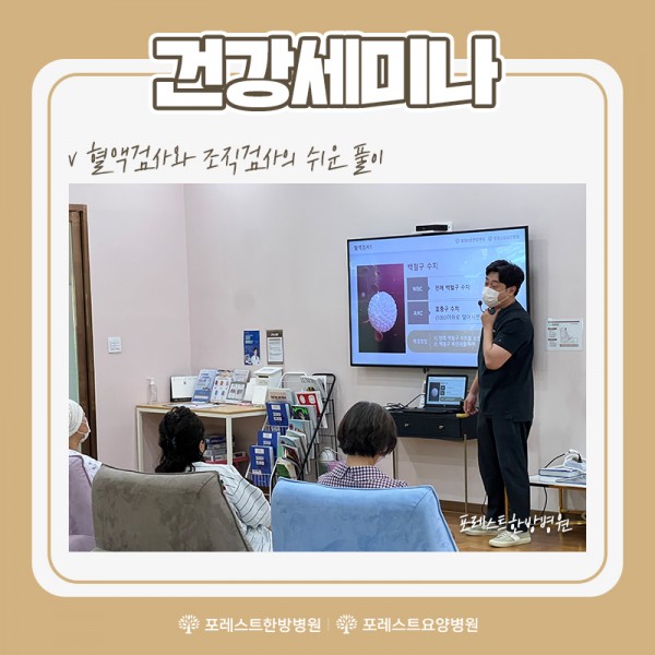 건강 세미나 지난주 포레스트한방병원 강동, 포레스트요양병원 강남에서는 혈액검사와 조직검사의 쉬운 풀이라는 주제로 포레스트환우분들을 위한 3회차 건강세미나가 진행되었습니다. :) 많은 환우분들이 함께 참여하셔서 이대연 대표병원장님의 강의에 경청하시고 메모해 가셨습니다~ㅎㅎ 포레스트는 환우분들께 건강에 도움이 되는 정보를 전달 드리기 위해서 더욱 유익한 강의를 준비하겠습니다 감사합니다 ^^ 목록