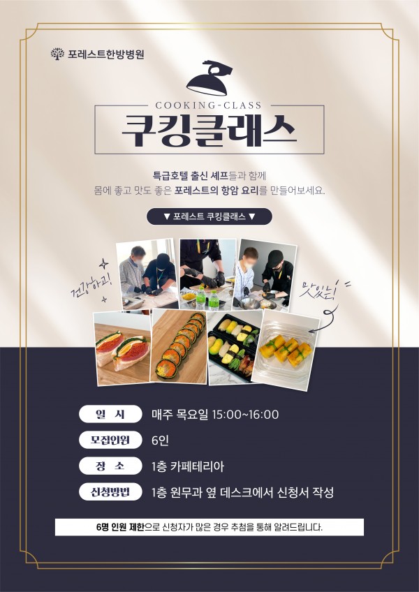 포레스트한방병원 쿠킹 클래스 매주 목요일 진행되는 포레스트한방병원의 쿠킹 클래스에서는 특급호텔 출신 셰프들과 함께 몸에 좋고 맛도 좋은 항암요리들을 직접 만들어 보실수 있습니다.^^ ▶일시: 매주 목요일 15:00~16:00 ▶모집인원: 6인 ▶장소: 1층 카페테리아 ▶신청방법: 1층 원무과 옆 데스크 신청서 작성 목요일은 포레스트 쿠킹클래스와 함께 하세요. :) 목록