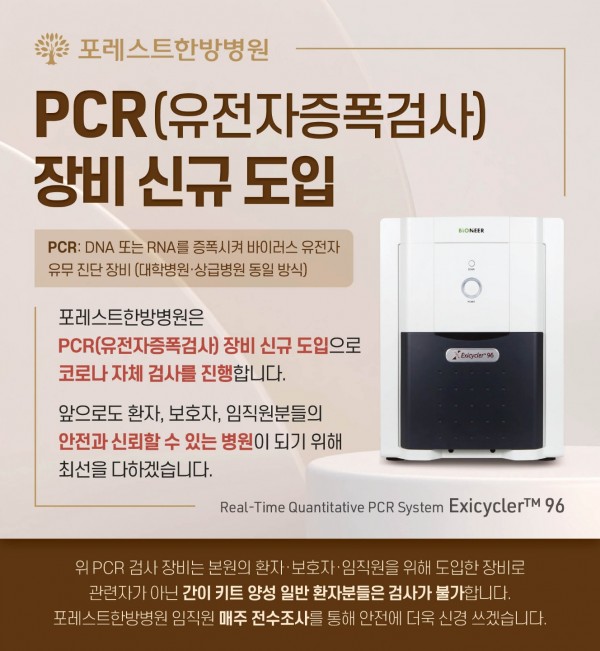 포레스트한방병원원 PCR(유전자증폭검사) 장비 신규 도입으로 코로나 자체 검사를 진행합니다.