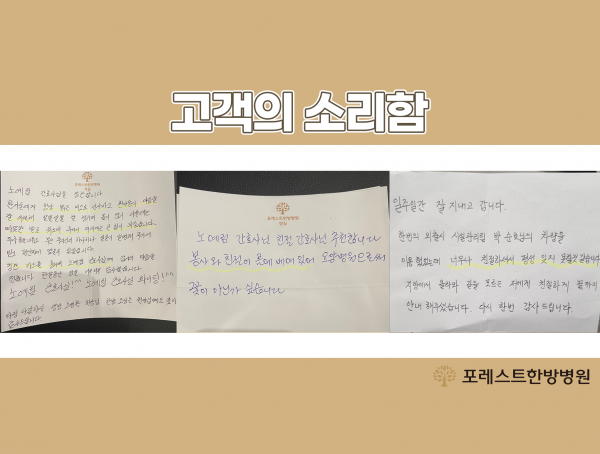 포레스트한방병원 고객의 소리함 포레스트한방병원의 따듯한 고객의 소리함입니다^^ 노예림 간호사님(잠실)과, 시설관리팀 박순호님(광화문)을 칭찬합니다! 환우분들의 따듯한 말씀 한마디가 저희에겐 너무나도 큰 힘이 된답니다!! 칭찬도 충고도 깊이 새겨 더욱 발전하는 포레스트한방병원이 되겠습니다. +고객의 소리함에 적어주신 의견을 반영하여 각 층마다 분리수거함 설치 예정입니다. :) 목록