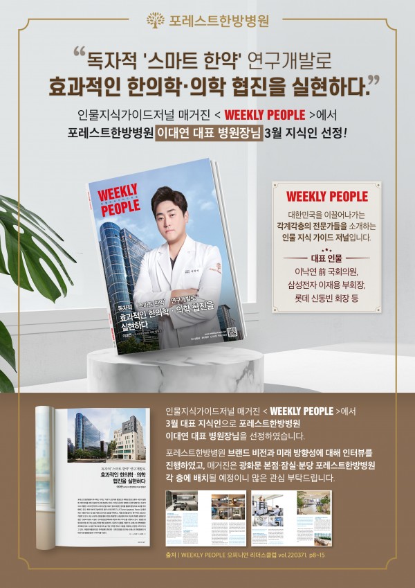 인물지식가이드저널 매거진 WEEKLY PEOPLE에서 포레스트한방병원 이대연 대표 병원장님이 3월 지식인에 선정되었습니다.