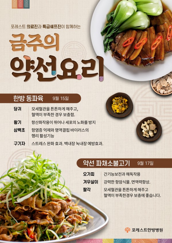 잠실 포레스트한방병원 의료진과 특급쉐프진이 함께하는 금주의 약선요리 잠실 포레스트한방병원 의료진과 특급쉐프진이 함께하는 금주의 약선요리 안내: ) 9월 15일 한방 동파육 9월 17일 약선 파채소불고기 목록