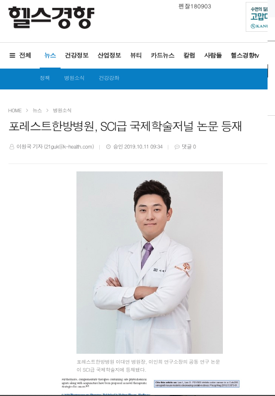 포레스트한방병원이 11일 이대연 병원장, 이인희 연구소장의 공동 연구 논문이 9월 SCI급 국제학술지에 등재됐다고 밝혔다.