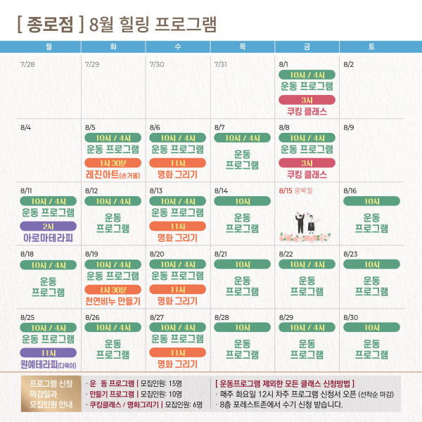 종로점 8월 힐링 프로그램 안녕하세요 포레스트입니다. 2025년 8월 15일은 광복 80주년입니다. 자유와 평화를 위해 희생하신 모든 분들께 깊은 감사를 드립니다. 숭고한 정신을 기억하며, 포레스트의 다양한 힐링 프로그램과 함께 뜻깊고 평안한 8월 보내시기 바랍니다. 많은 관심과 참여 부탁드립니다! ✅ 문의 전화 : 포레스트 1899-5868 ✅ 홈페이지 : foresthospital.co.kr ✅ 유튜브 : ‘포레스트병원’ 검색 목록