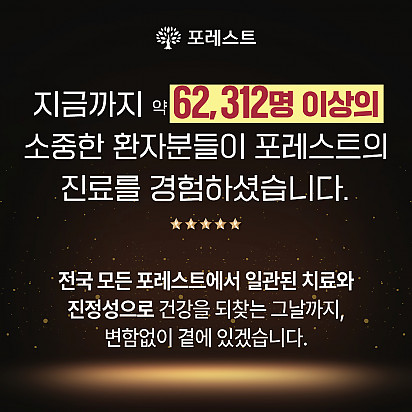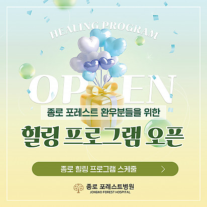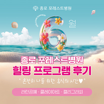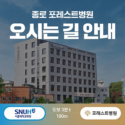자궁내막암 3기, 박지혜 환우님의 희망일지 ep_1 | 포레스트 환우 이야기 2024.08.08 자궁내막암 3기, 박지혜 환우님의 희망일지 ep_2 | 포레스트 환우 이야기 2024.08.08 자궁내막암 3기, 박지혜 환우님의 희망일지 ep_3 | 포레스트 환우 이야기 2024.08.08 폐암 4기(비소세포암), 서중원 환우님의 희망일지 ep_1 | 포레스트 환우 이야기 2024.08.08 폐암 4기(비소세포암), 서중원 환우님의 희망일지 ep_2 | 포레스트 환우 이야기 2024.08.08 폐암 4기(비소세포암), 서중원 환우님의 희망일지 ep_3 | 포레스트 환우 이야기 2024.08.08 Hot 종로점 7월 힐링 프로그램 7월, 본격적인 무더위의 시작! 더운 날씨 속, 지치고 무기력해지기 쉬운 요즘 마음까지 시원해지는 힐링이 필요할 때입니다.… 2025.06.26 Hot 이달의 포레스트 얼굴을 소개합니다! 의료의 중심엔, 사람이 있습니다. 이달의 포레스트 얼굴을 소개합니다. 포레스트는 ‘사람 중심’의 의료를 실천합니다. … 2025.06.24 Hot [종로 포레스트]힐링프로그램 후기 안녕하세요, 포레스트입니다:) 오늘은 종로 포레스트병원에서 진행된 힐링 프로그램의 따뜻한 순간들을 전해드립니다. 포레스… 2025.06.19 Hot 종로 포레스트병원 쿠킹 라이브 코너 공개 안녕하세요 포레스트입니다! 무더운 여름, 기력회복은 삼계탕! 종로 포레스트병원 쿠킹 라이브 코너를 공개합니다! 1.… 2025.06.12 Hot 종로 힐링 프로그램 오픈 안녕하세요, 포레스트입니다! 종로 힐링 프로그램이 6월 9일부터 시작됩니다! 6월 9일 오픈! 지친 몸과 마음을 위… 2025.06.05 Hot 포레스트, 늘 곁에 있는 치료의 이름 안녕하세요 포레스트입니다. 지금까지 약 62,312명 이상의 소중한 환자분들이 포레스트의 진료를 경험하셨습니다. 전국 모… 2025.06.02 Hot 종로 포레스트 여유로운 산책길 [종로 포레스트 여유로운 산책길을 소개합니다] 서울대학교병원 도보 3분 거리, 조금만 발걸음을 옮기면 마로니에 공원의 풍… 2025.05.20 Hot 종로 포레스트병원의 시설을 소개합니다 종로 포레스트병원의 시설을 소개합니다???? 종로 포레스트병원은 암 환우분들의 치료 편의성을 고려하여 2025년 신규 건축… 2025.05.16 Hot [종로 포레스트병원 오시는 길] 서울대병원 도보 3분 거리! [오시는 길] 서울대병원 도보 3분 거리! 암 집중 진료 | 종로 포레스트병원 오시는 길 안내 *서울대병원 암병원에서 … 2025.04.30 12345 Search 검색대상 제목 내용 제목+내용 회원아이디 회원아이디(코) 글쓴이 글쓴이(코) 검색어 필수