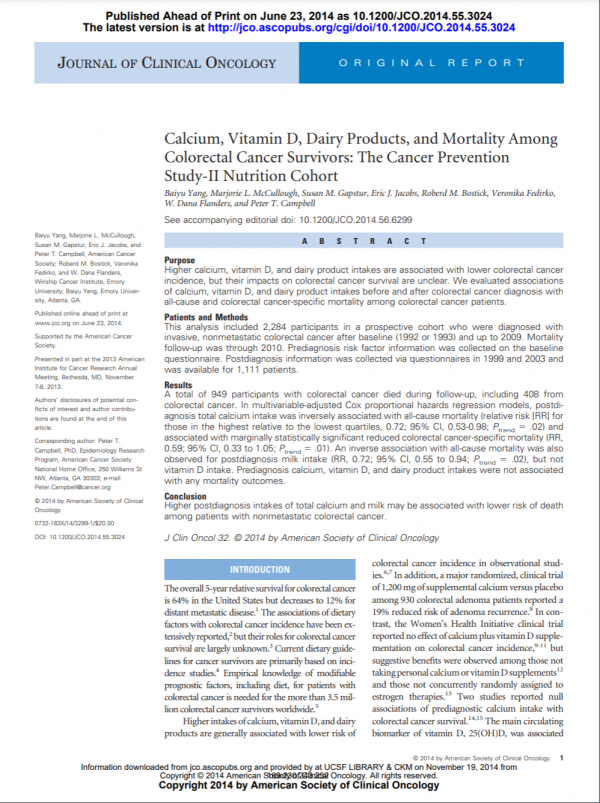 암진단 이후 1주일 평균 1,750ml 이상의 우유를 섭취한 대장암 환자는 생존율이 상승함. 2022.05.23 14:17 499https://sci-hub.se/10.1200/jco.2014.55.3024 암진단 이후 1주일 평균 1,750ml 이상의 우유를 섭취한 대장암 환자는 생존율이 상승함. Calcium, Vitamin D, Dairy Products, and Mortality Among Colorectal Cancer Survivors: The Cancer Prevention Study-II Nutrition Cohort https://sci-hub.se/10.1200/jco.2014.55.3024 목록