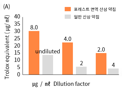 포레스트 면역 산삼 약침 일반 산삼 약침 약재활성도 비교 後 일반 산삼 약침 약재활성도 低(일부 활성도 0), 포레스트 면역 산삼 약침 약재활성도 高.