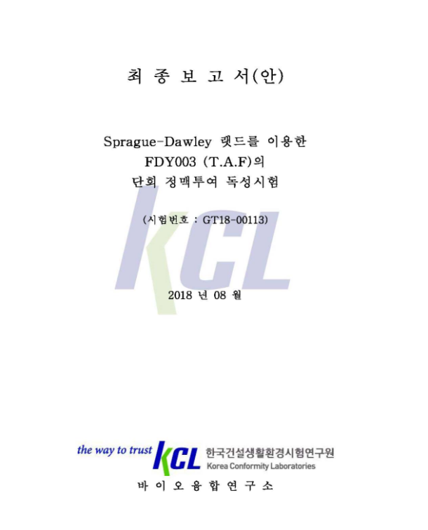 연구특징 제형개발 효능실험 독성실험 약리성분 분석실험 품질관리 T.A.F의 안전성 타프는 GLP 독성시험에서 주사와 복용에 대하여 각각 임상 사용농도의 2,000배, 20,000배 농도까지 독성이 발견되지 않았습니다. 한약은 효능도 중요하지만, 그에 따른 부작용도 염두해 두어야 합니다. 이에 저희는 식약처에서 인증된 독성시험을 진행하여 약재의 성분적 안전성을 확인하고 있습니다. 보다 안전한 약을 공급하기 위하여 노력합니다. < TAF(FDY003) GLP 독성시험 경구투여 > < TAF(FDY003) GLP 독성시험 약침투여 >